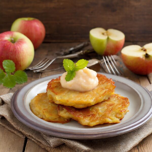 Wer sich auf dem Weihnachtsmarkt noch nicht dran sattgegessen hat und auch im Januar noch Lust auf Krumpernschnietscher (oder Kartoffelpuffer) hat, der kann schnell ein einfaches und günstiges veganes Gericht auf die Teller bringen. Auf das Ei, was zur Bindung häufig unter den Teig gemischt wird, kann ganz einfach verzichtet werden. Wichtig ist dabei nur, dass die Kartoffeln gut ausgedrückt und mit ausreichend Mehl vermengt werden. Dann klappt es auch mit der Bindung!