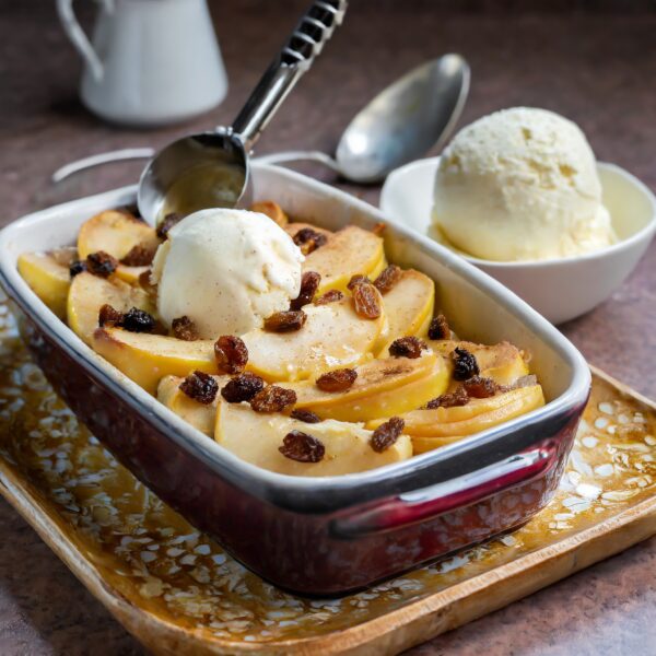 Dieses einfache Dessert, das ursprünglich aus dem Saarland stammt, schmeckt besonders mit einer Kugel (pflanzlichem) Vanilleeis prima. Für die Äpfel muss man zunächst nur Viez mit Zimt, Vanille und Rosinen aufkochen. In einer Auflaufform werden die halbierten und entkernten Äpfel danach mit dem gewürzten Viez übergossen und für ca. 15 min bei 180°C im Ofen gebacken. Besonders während der kalten Jahreszeit wärmt dieses Gericht von innen.