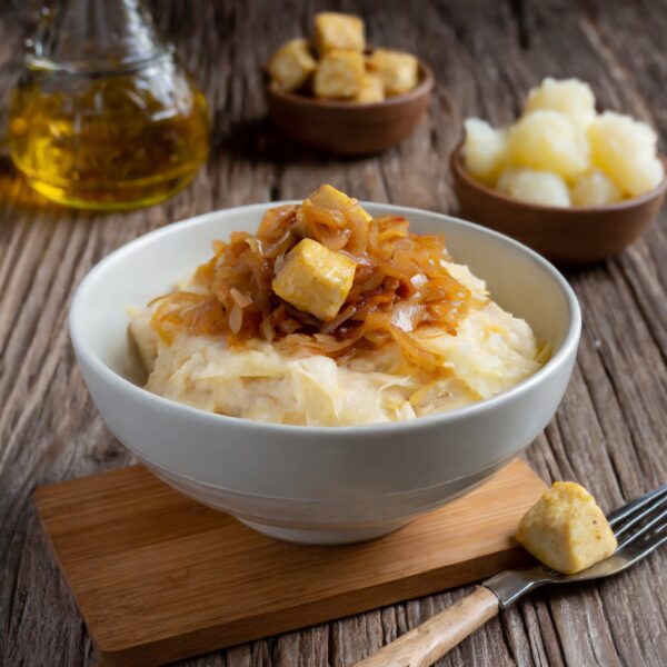 Die Hauptzutaten des Trierer Klassikers, Sauerkraut und Kartoffeln, sind immer schon vegan. Um ein cremiges Püree herzustellen, eignen sich – statt Milch und Butter – pflanzliche Alternativen insbesondere dann gut, wenn sie ungesüßt sind. Wer auf ein herzhaftes Topping nicht verzichten will, kann den üblichen Speck mit kross gebratenen Würfeln aus Räuchertofu ersetzen. Klassischerweise gehört auch Riesling ins Teerdisch – aber ist Wein nicht sowieso vegan? Hier kommt es auf die Klärungsmethode an: Wenn bei der Klärung tierische Produkte, etwa Gelatine, genutzt werden, ist der Wein nicht vegan. Alternativen, auch von der Mosel, gibt es inzwischen aber viele.